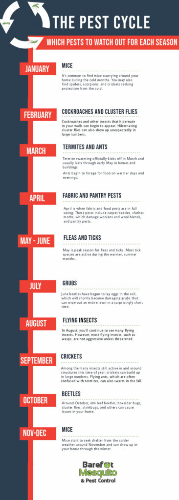 HERE’S A LOOK AT A GENERAL PEST CYCLE AND WHEN YOU CAN EXPECT TO SEE PESTS INSIDE AND OUTSIDE OF YOUR HOME.